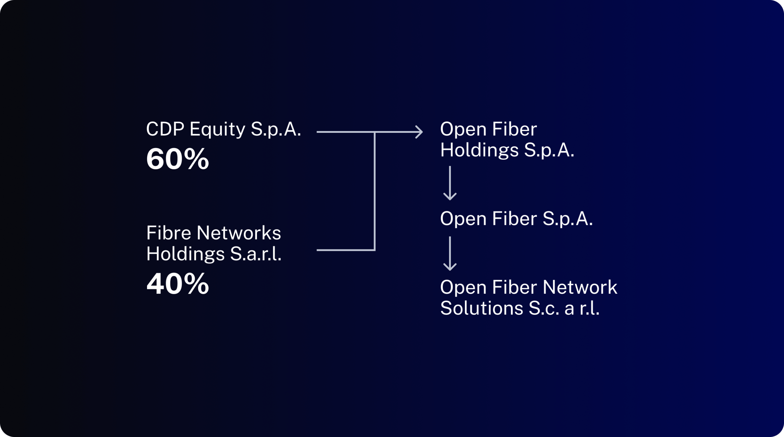 La società  – da dicembre 2021 – è soggetta alla direzione e coordinamento del socio unico Open Fiber Holdings S.p.A., società partecipata al 60% da CDP Equity S.p.A. (società riconducibile al gruppo Cassa depositi e prestiti) e al 40% da Fibre Networks Holdings S.a.r.l. (società riconducibile al gruppo Macquarie).