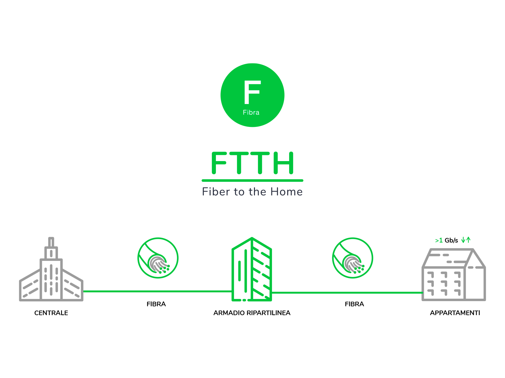 Le prestazioni più elevate sono garantite dalle reti di tipo FTTH, Fiber To The Home, ossia fibra fino a casa. L’intero percorso dalla centrale al router di casa è realizzato in fibra ottica. Questo tipo di rete mantiene pressoché intatta la potenza del segnale dalla fonte all’utente finale e garantisce le stesse velocità di trasmissione sia in download che in upload. Il piano di copertura dell’infrastruttura di rete in fibra ottica è in continua espansione, per garantire una capillarità in tutto il territorio italiano. Un processo che consentirà di sostituire nel tempo le tecnologie obsolete come quelle dei cavi in rame o misto rame. Queste soluzioni ibride possono essere di diversi tipi: FTTN e FTTC sono le più comuni.