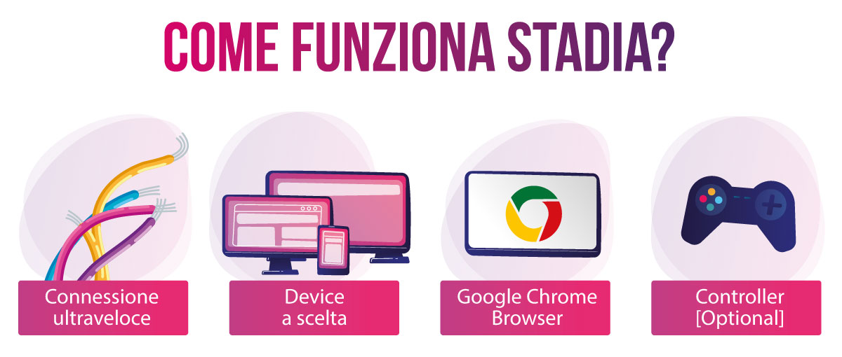 La ricchezza grafica ed esperienziale dei videogame attuali richiede macchine dalle prestazioni sempre più alte. Google Stadia punta ad abbattere le barriere economiche legate all’acquisto di console o pc per il gaming con la possibilità di giocare online su cloud e server dedicati. Niente download, niente installazioni né requisiti minimi di memoria. Basterà accedere alla piattaforma Google Stadia attraverso il browser Chrome e disporre di una connessione internet stabile e veloce per garantire una buona risposta in termini di trasmissione dei dati con il cloud. Sarà quest’ultimo a far girare il gioco, mentre sullo schermo verrà trasmesso l’output video con cui interagire tramite controller.  Quanto al dispositivo utilizzato per la connessione, la scelta sarà tutta in mano al giocatore. Un pc con Chrome, una smart tv con Chromecast, un tablet o persino uno smartphone saranno tutte soluzioni adeguate.