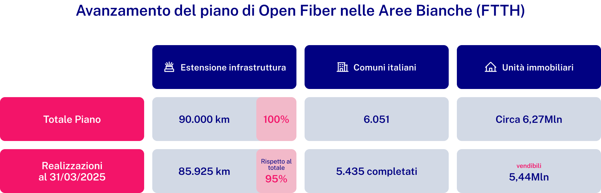 Sono stati realizzati 85.925 km di infrastruttura realizzata (95% del totale previsto dal piano). I km di rete rappresentano lo sviluppo infrastrutturale (costruzione, scavo, riutilizzi, posa dei cavi, etc.) necessario per la realizzazione della rete in concessione.
