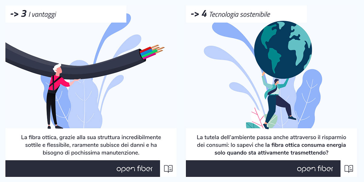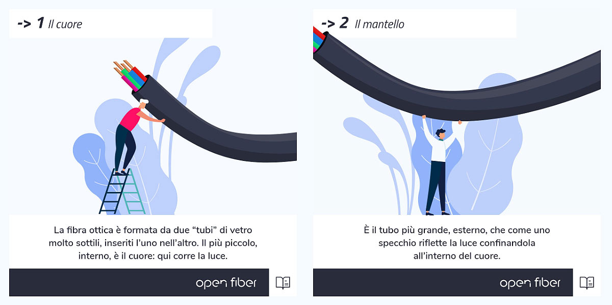 Un cuore e un mantello di vetro sottile protetti da un rivestimento in materiale plastico. Sono questi gli elementi della fibra ottica, la tecnologia che consente una connessione veloce, sicura e a risparmio energetico. La fibra ottica FTTH (Fiber To The Home) di Open Fiber è l’unica che garantisce una velocità di trasmissione fino a 1 Gigabit per secondo, sia in download sia in upload. Si ottiene così il massimo delle performance con prestazioni non raggiungibili con le reti.