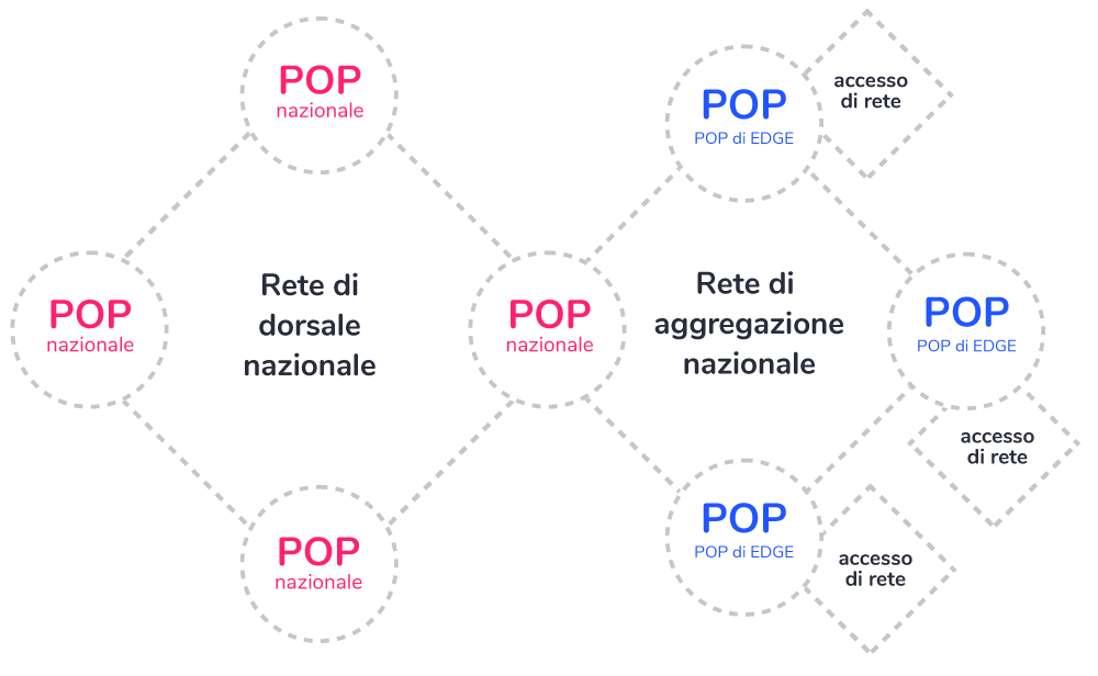 I PoP Nazionali sono distribuiti in modo da poter garantire la piena copertura di tutto il territorio nazionale e prevede collegamenti ottici ad altissima capacità (lambda coerenti 100/200G).