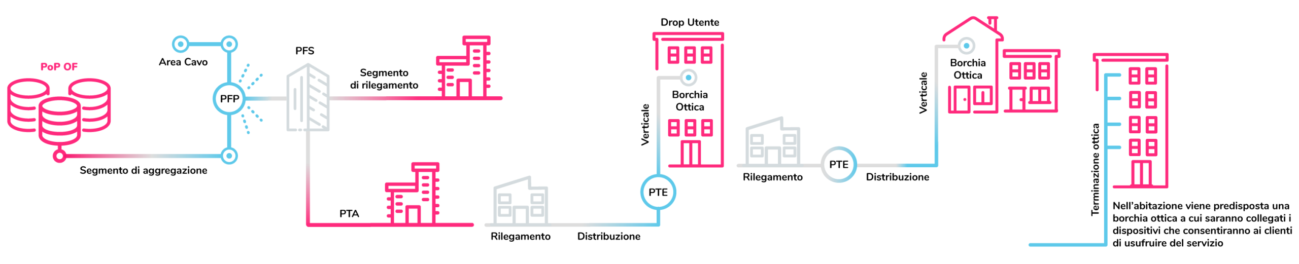 L’architettura Open Fiber “punto-multipunto” si basa sulla realizzazione di una rete in cui le risorse ottiche di concentrazione (Alberi PON) sono condivise dai diversi attori, mentre il collegamento finale con l’utente è realizzato con una singola fibra dedicata.